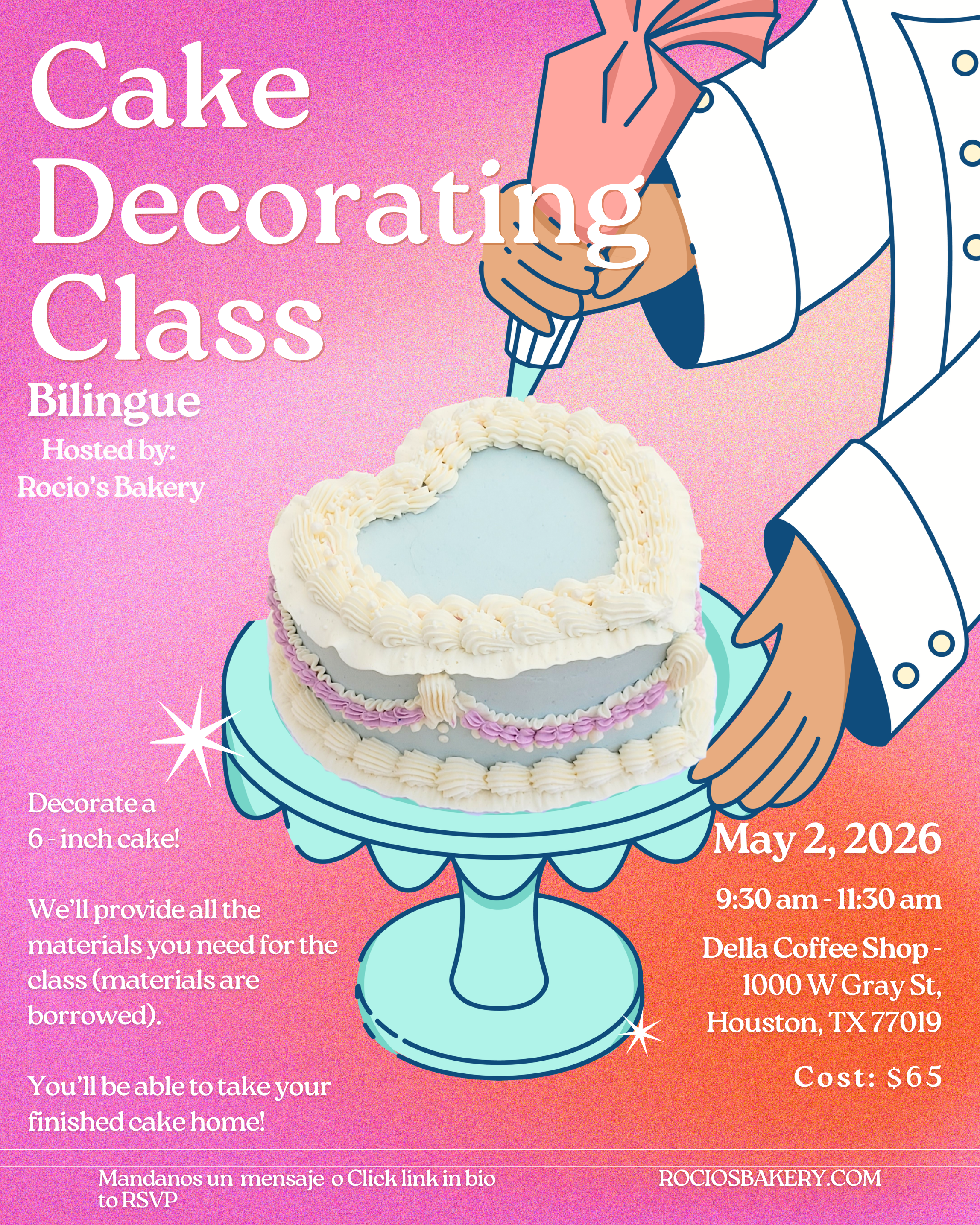 ¡Ven a decorar con nosotros! Aprende a crear un adorable Pastel temático Vintage en una clase divertida y relajada. En esta clase práctica, decorarás un pastel de 6 pulgadas usando una crema de merengue suizo, y te proporcionaremos todos los materiales necesarios y lo mejor de todo ¡te llevarás a casa tu pastel vintage terminado! 💗